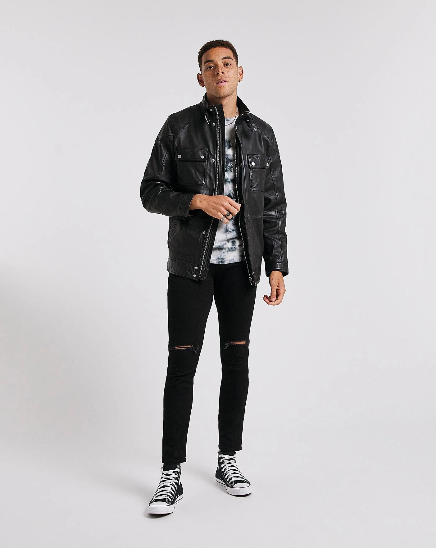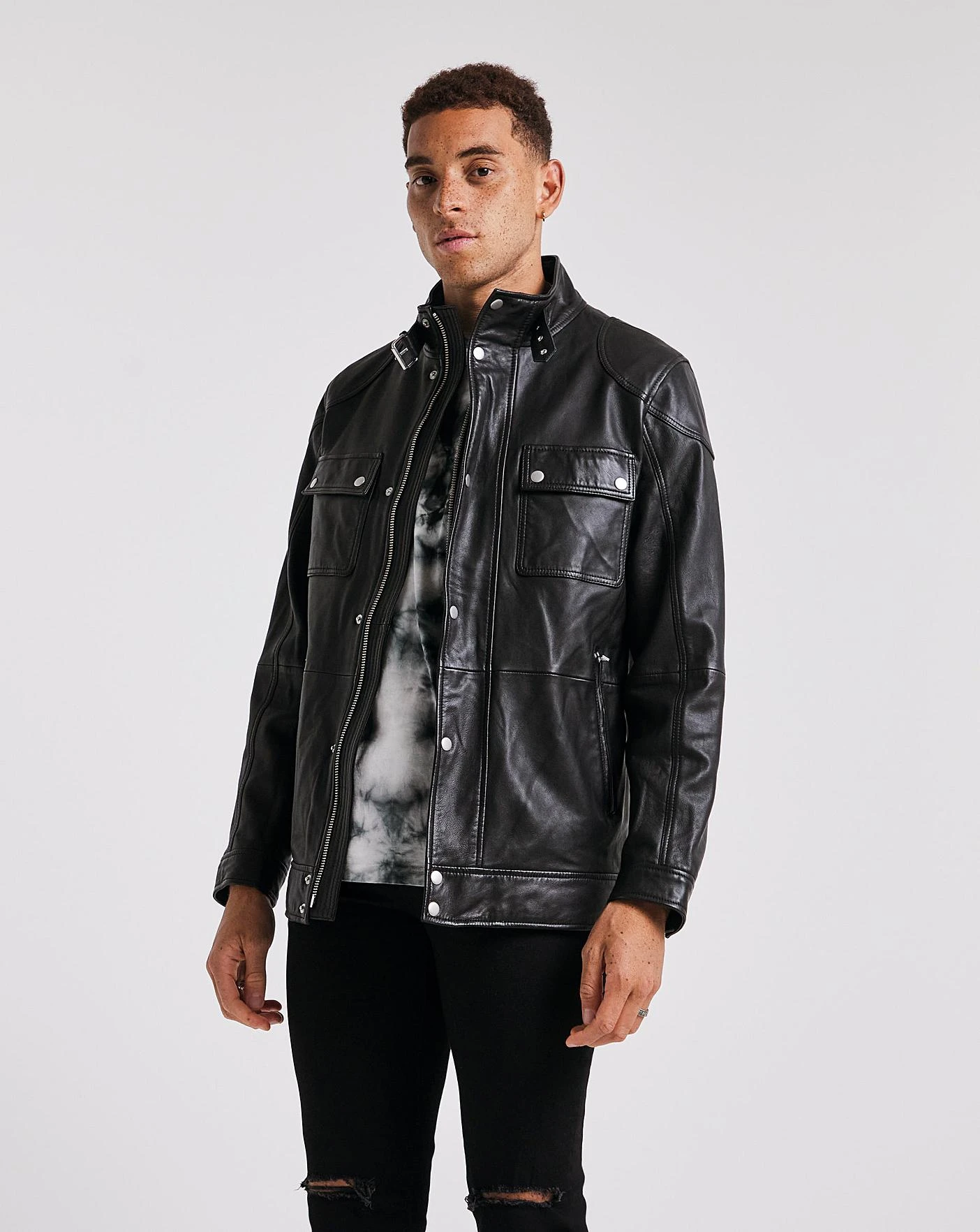 Invest in the jacket of a lifetime with this timeless 100% real sheep leather jacket. It features 4 frontal pockets that help keep your essentials safe and secure. It also features a double zip and button frontal closure and buckle neck detail.
