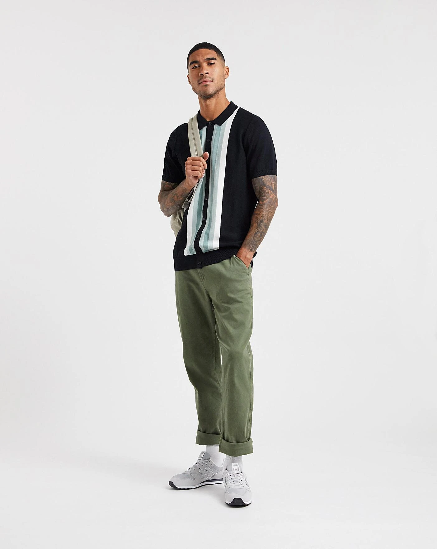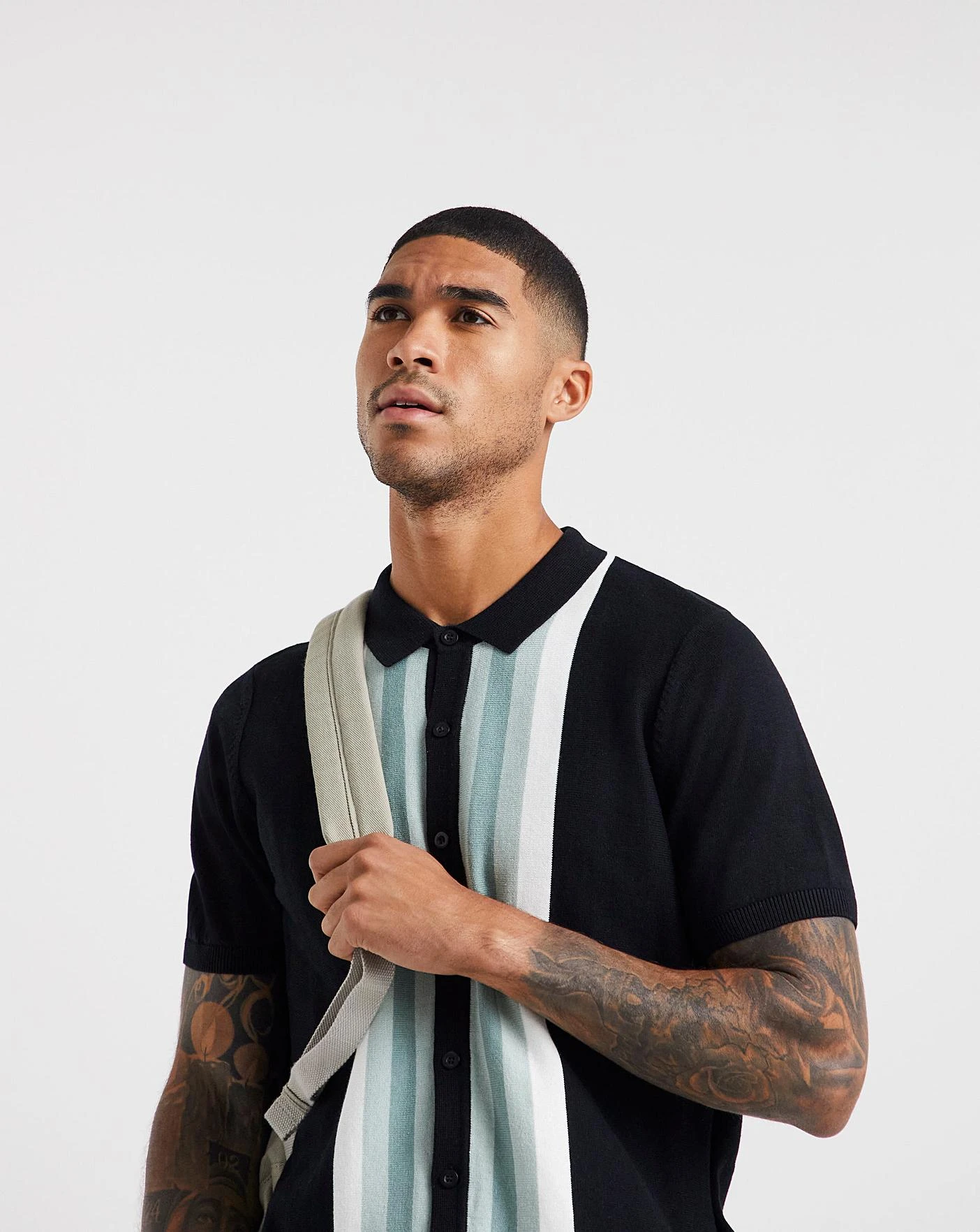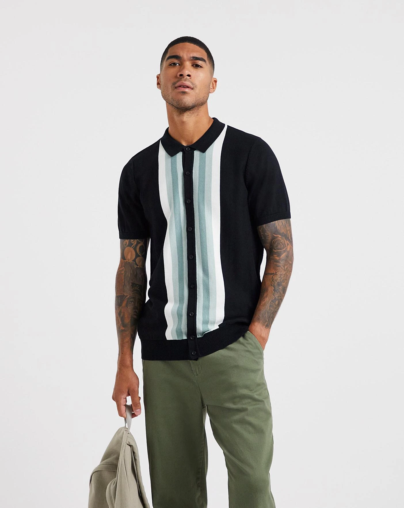 Stay stylish with the retro inspired knitted button through vertical striped polo. The navy among the lighter blues will add a pop of colour to your wardrobe while keeping you warm and cosy.