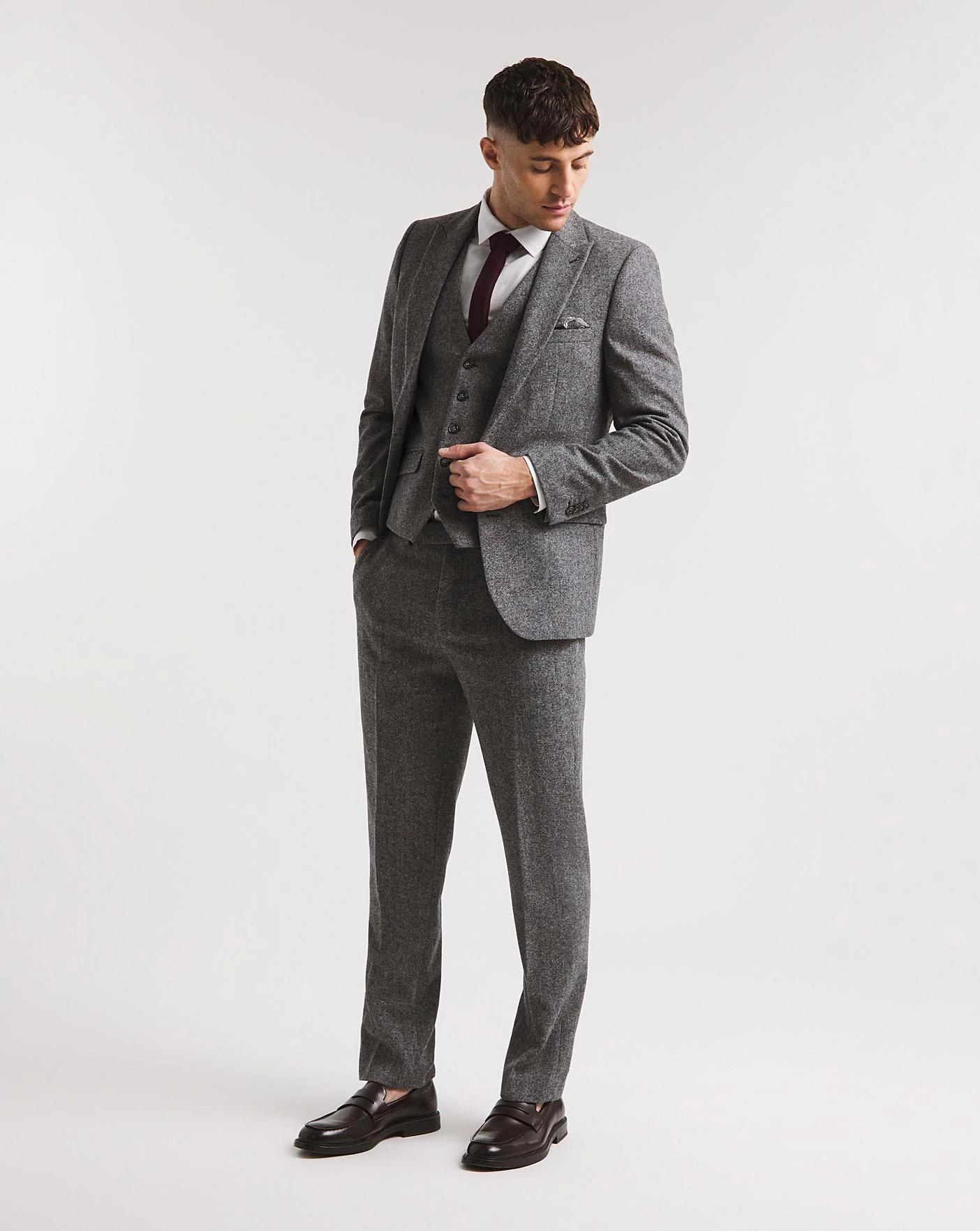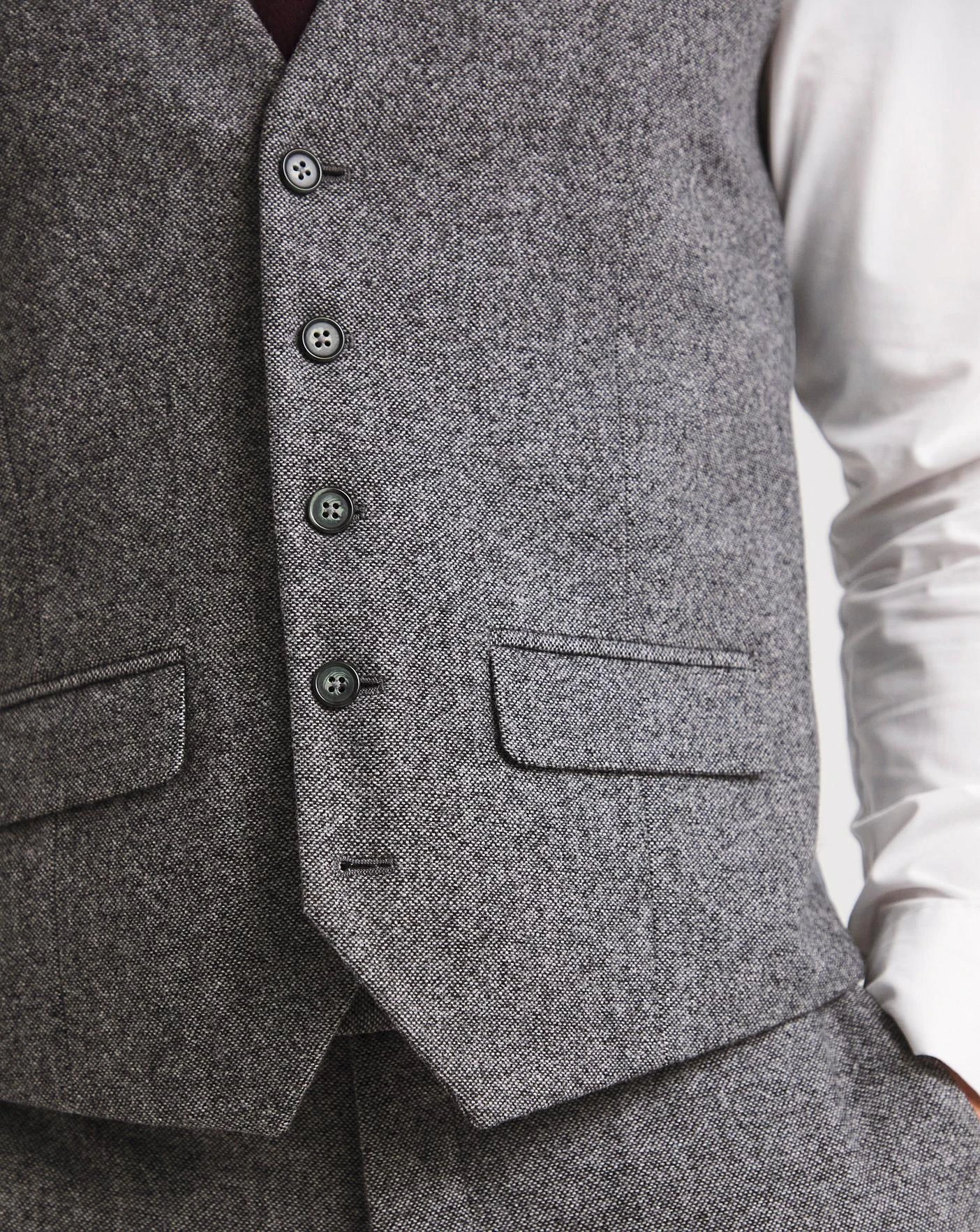 This charcoal donegal tweed suit waistcoat is fresh and smart for the season. Pair with the matching suit trouser and jacket for a trendy yet smart look for any occasion this season.