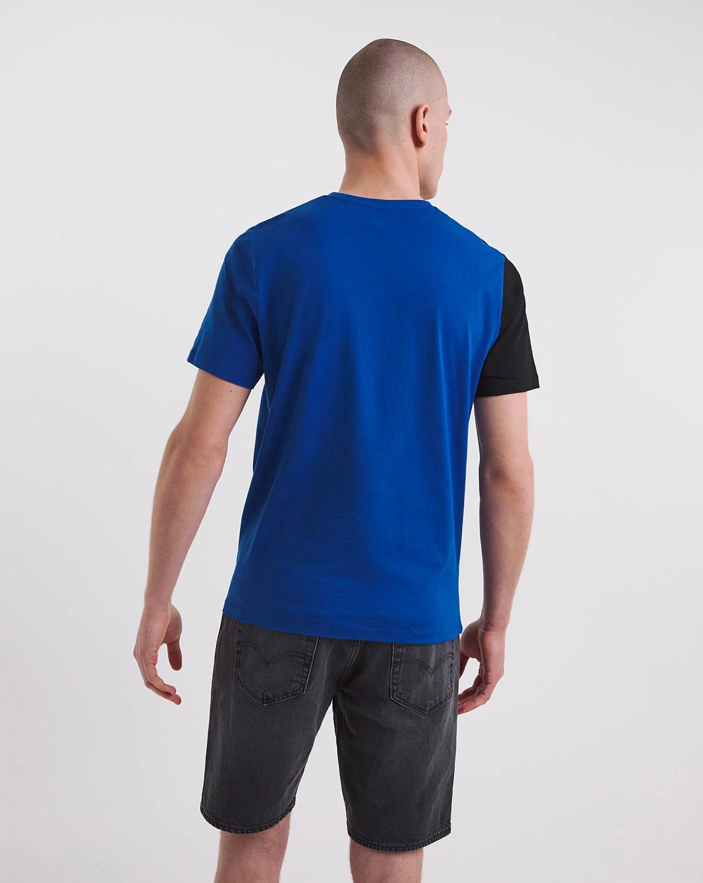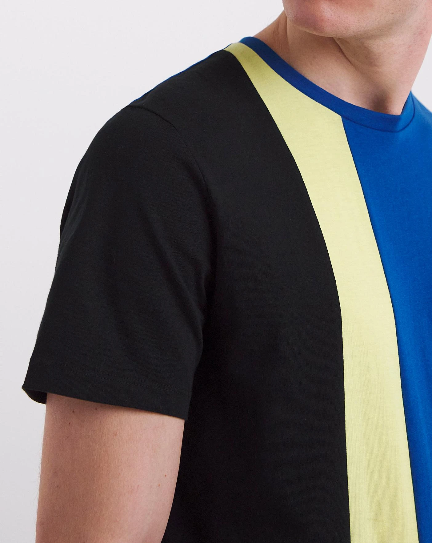 This Cut and Sew T-shirt Long in black/blue is fresh and new for the season. The added long length creates comfort.