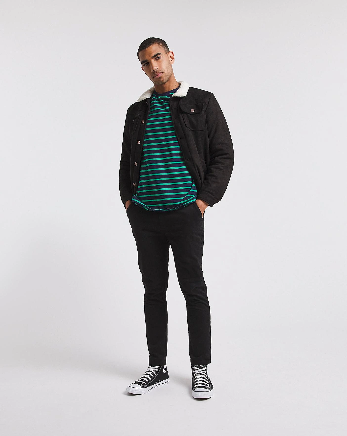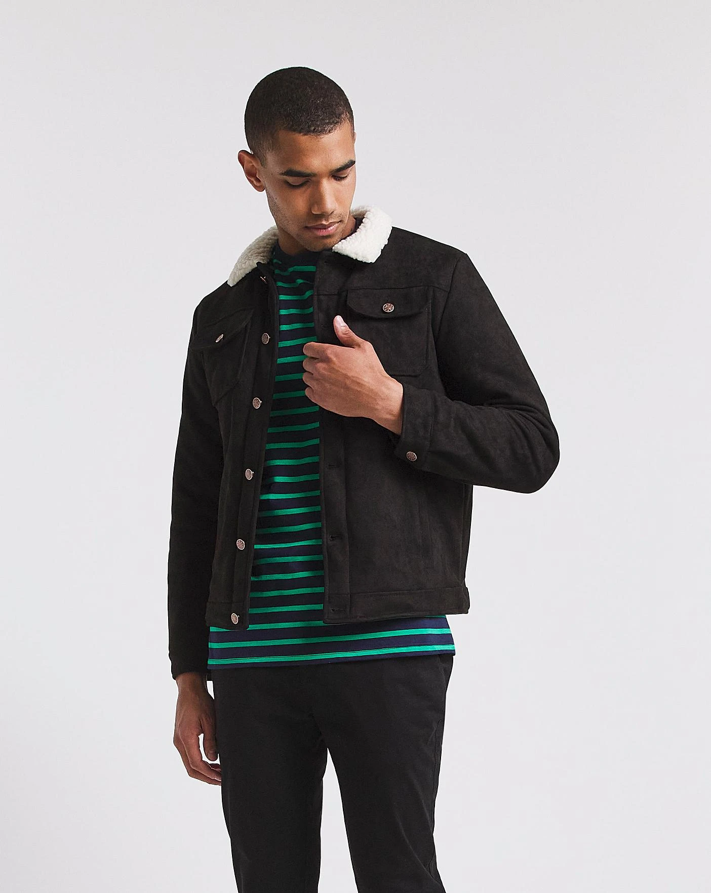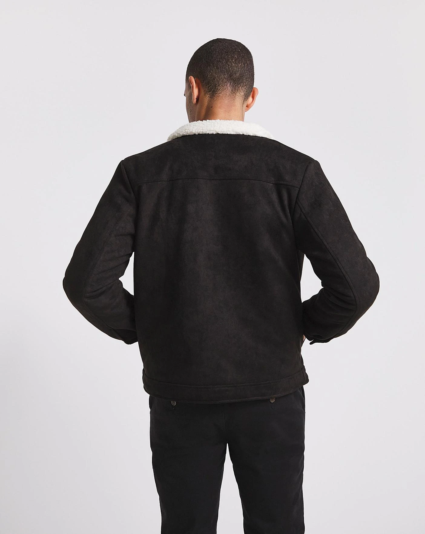 Stay snug in this soft suede trucker jacket. This can be easisy paired with a tshirt and slim jeans for a smart day look. The borg collar and copper toned buttons give the jacket a premium look. Featuring two hand pockets and additional chest pockets so your never stuck for storage.