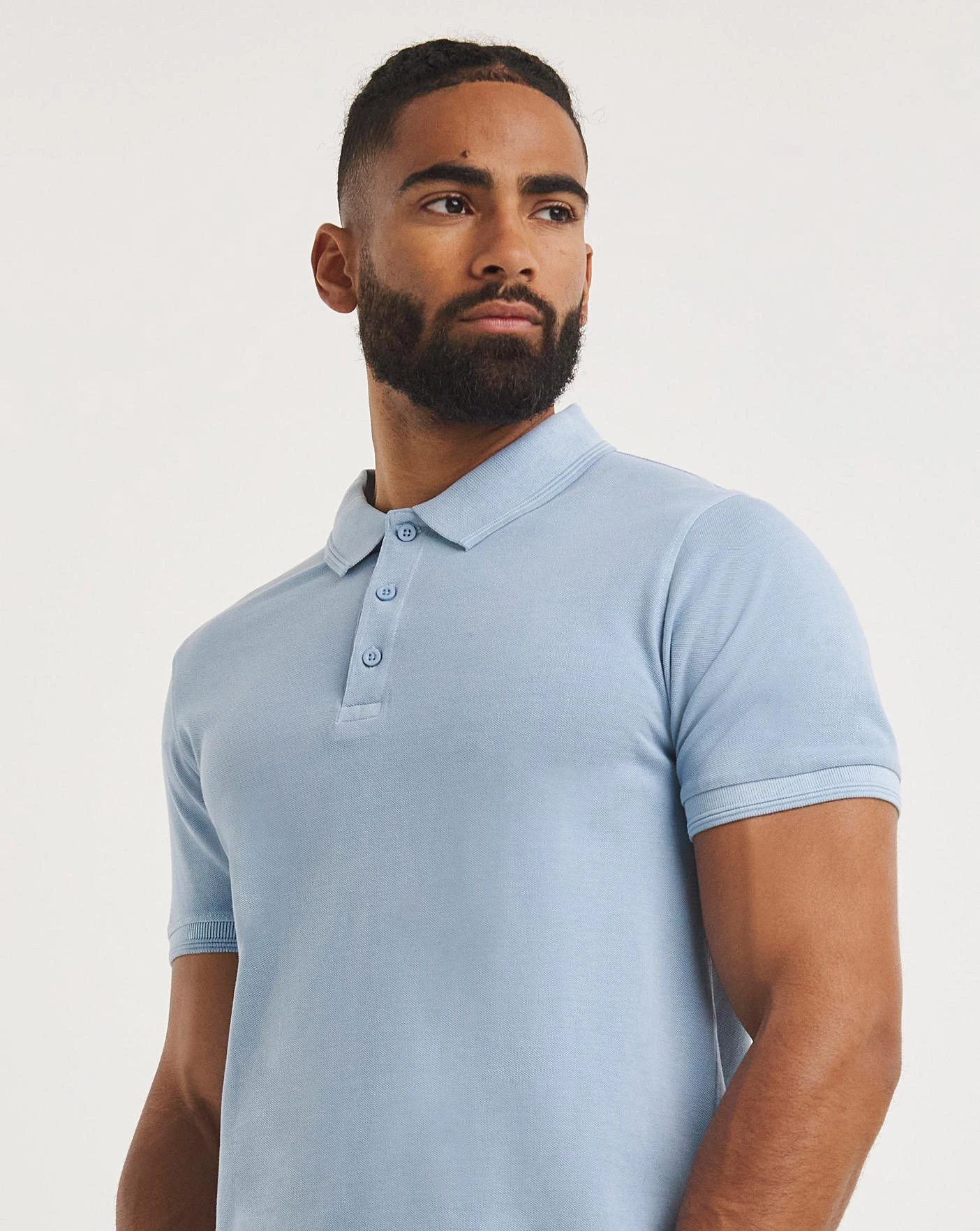 This Garment Dye Polo in a long length in mid blue is fresh and stylish for the season. The long length creates added fit and comfort.