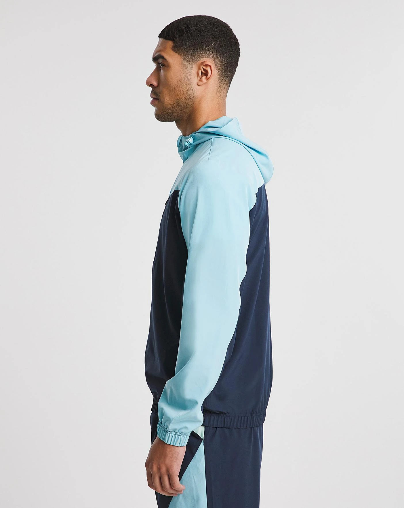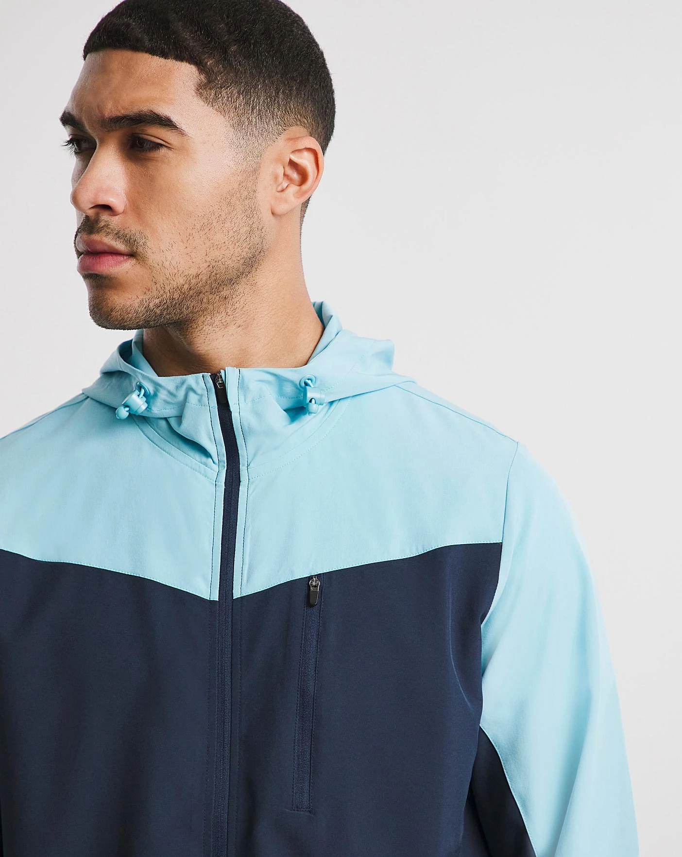 This blue and navy windbreaker from Jacamo Active can be worn layered over a sweatshirt or long sleeve top to cut through wind chill. This zip up top is light weight and contains stretch properties within its fabrication for extra comfort while you are on the move. It also features a hood with toggles so it can be pulled tight around your face and a front zip chest pocket .