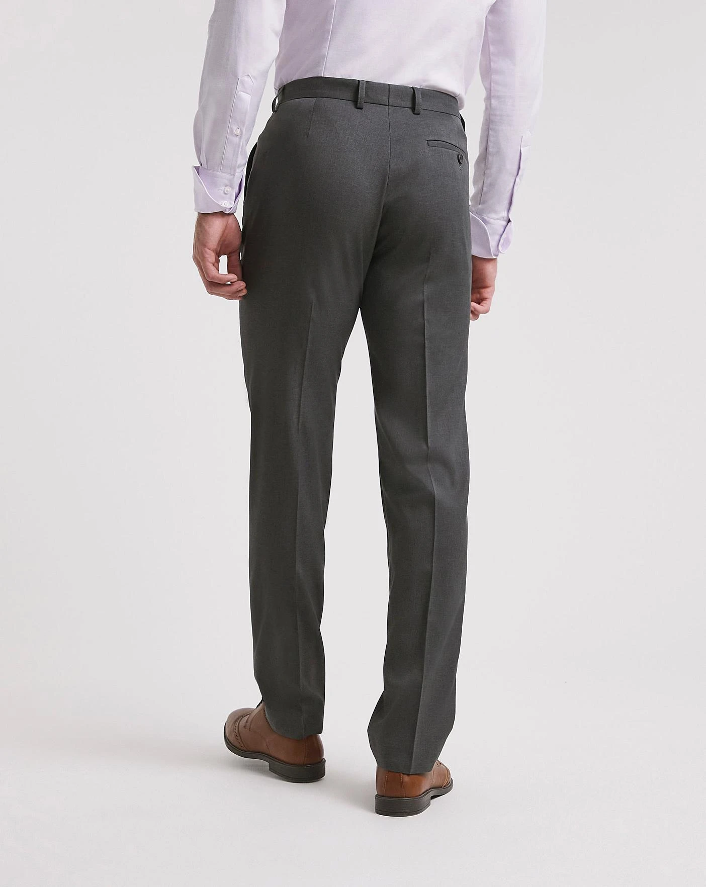 Suit trousers with a zip fly, hook-and-bar fastening with button, two side pockets, belt loops and one rear pocket with button fastening.