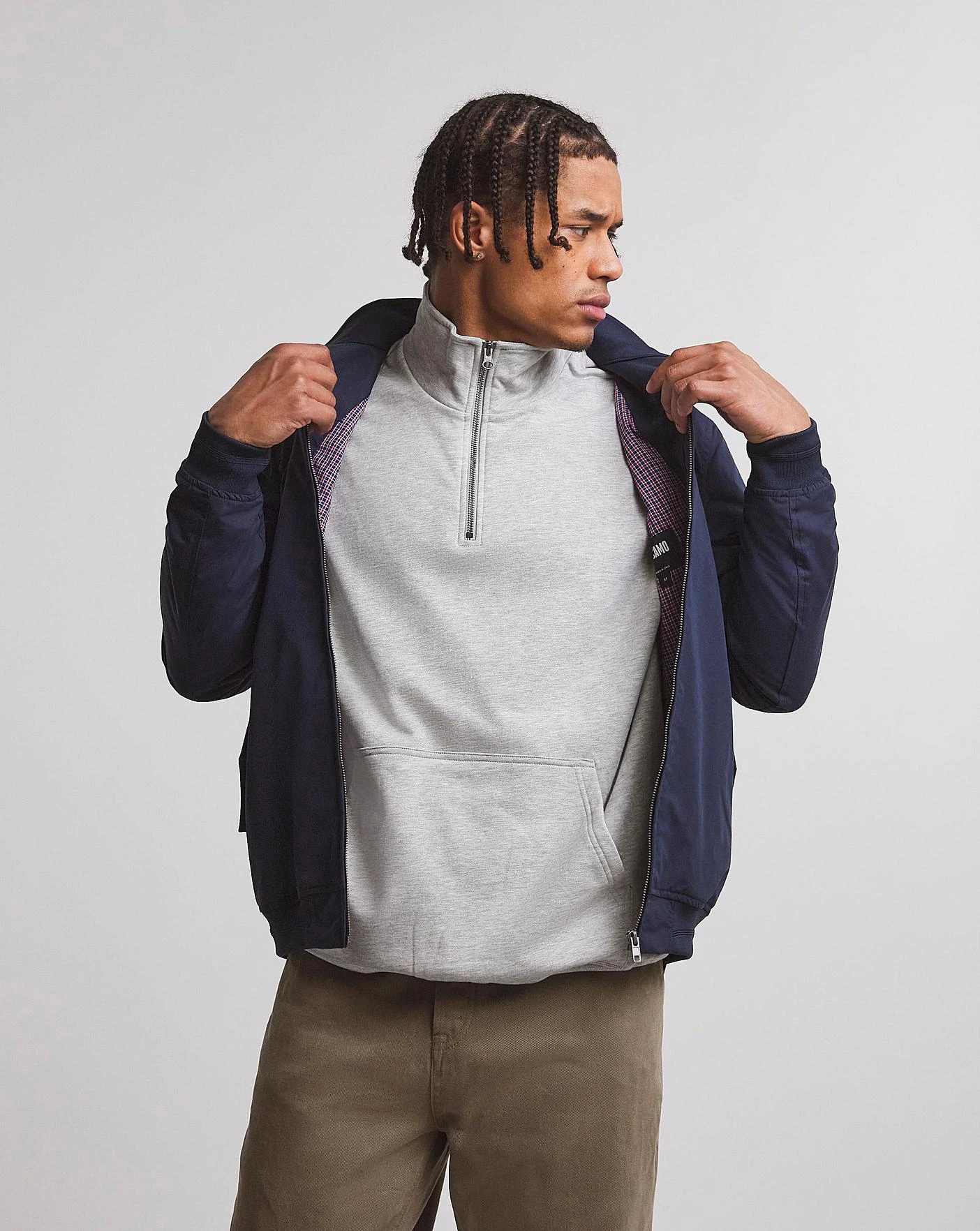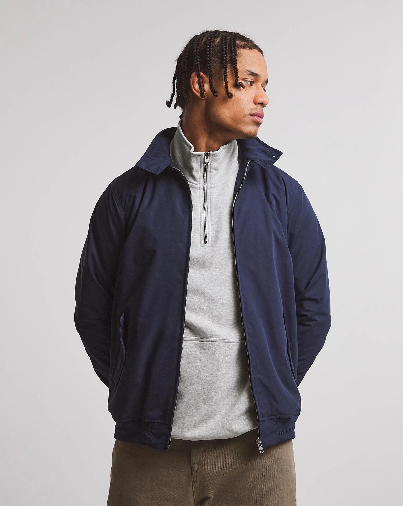This rich navy harrington is the perfect staple piece to finish off your everyday outfit for that casual yet stylish look. It is designed in a regular shape so it should fit your frame for a more tailored look. It features a full length, main zip fastening which allows the piece to be worn zipped up or down, depending if you want to show off that new tshirt underneath. The double button collar is also classic for a harrington jacket showing that it is truely timeless and you can expect to still be wearing it years down the line. The soft rib cuffs taper the sleeves in at the wrist giving a neat and presentable finish to the jacket overall.