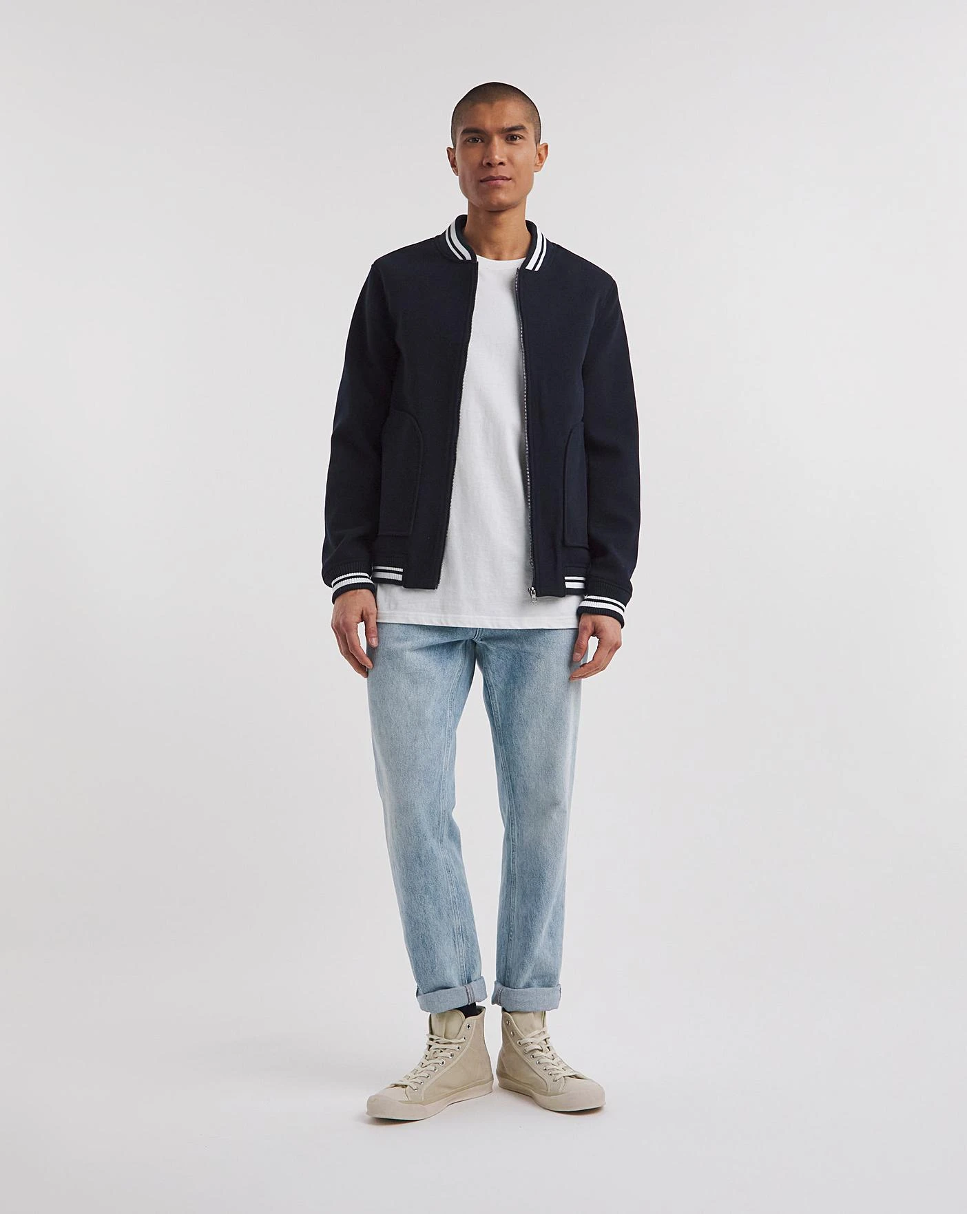 Give your spring wardrobe an upgrade with the navy varsity jacket. The sleek and minimal design allows it to be worn with multiple different outfits as well as lasting many more seasons to come